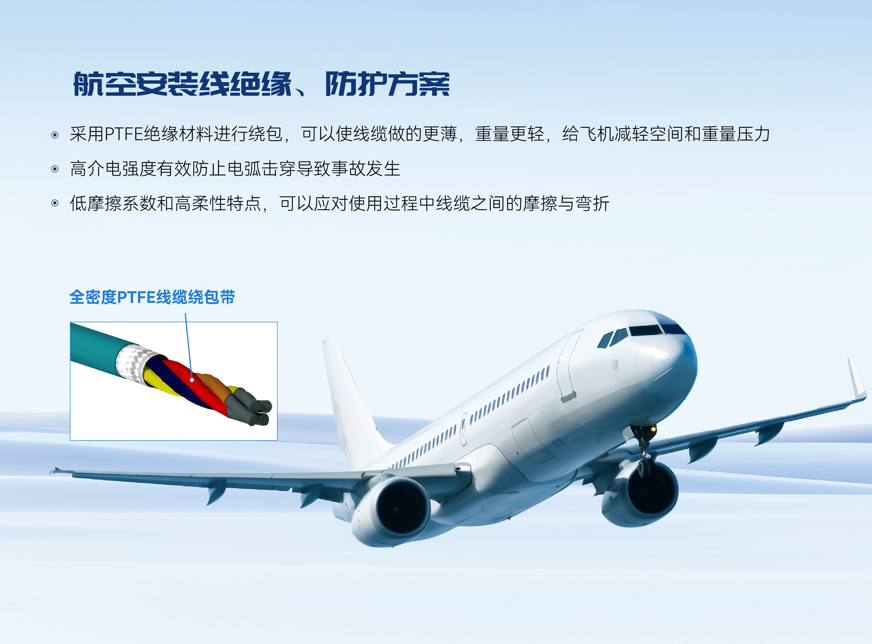 航空安装线作为电力传输的介质,连接各电子元器件,遍布在飞机的各个位置,起火、电弧等安全事故容易沿着线缆蔓延开来,而且飞机运行时工况特殊,需要应对环境温度、气压的频繁变化,因此对线缆绝缘、护套材料的选择有着严格的要求,主要考虑防火、耐高低温、耐电弧击穿等性能。