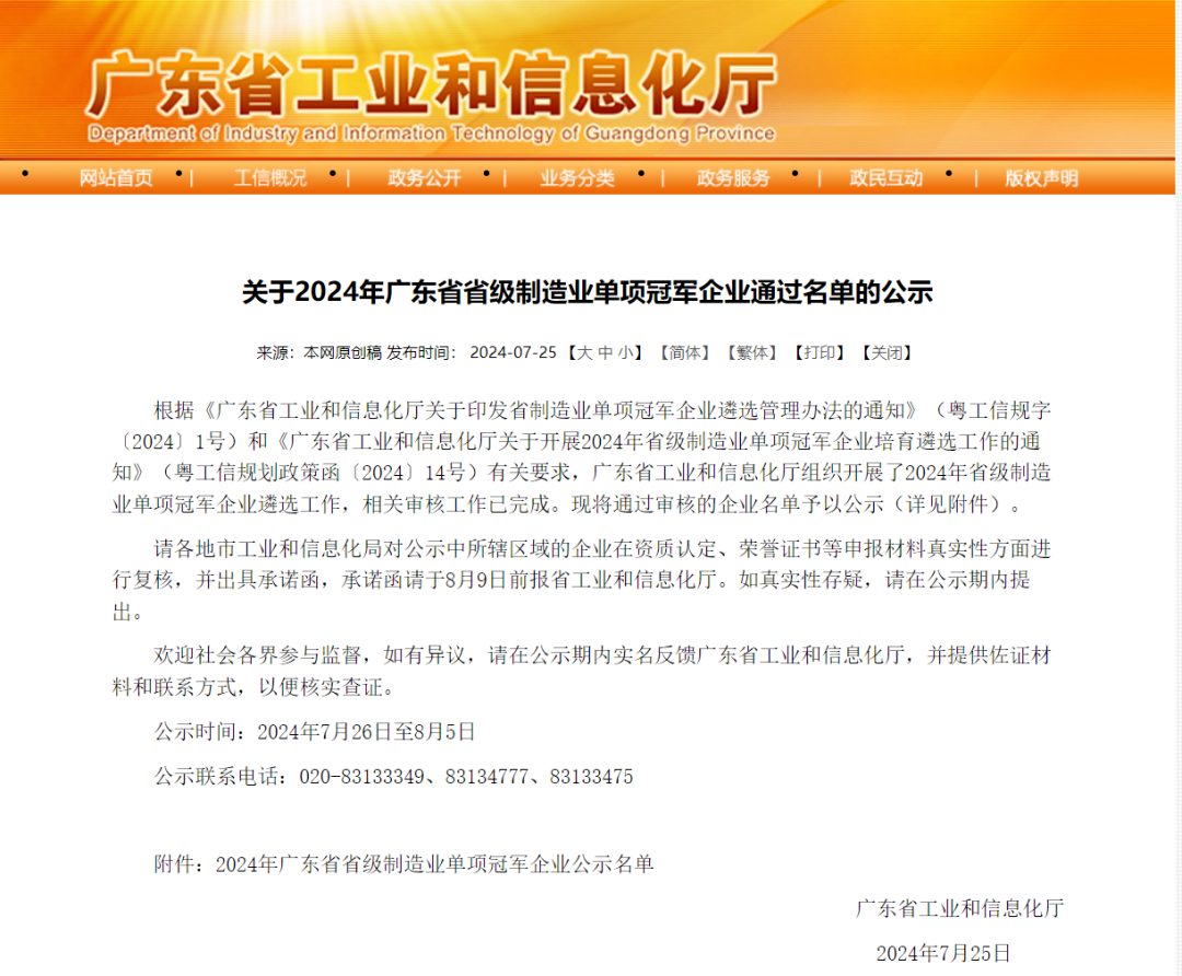 “广东省省级制造业单项冠军企业”评选旨在表彰那些长期专注于特定细分领域,并具备强大创新能力和国际竞争力的企业。入选企业在生产技术或工艺水平上达到国内外领先水平,其单项产品或服务的市场占有率位居全球或全国前列。此次上榜企业涵盖新能源、新材料、智能制造、自动化、医疗等多个高新技术领域,彰显了广东省在高端制造业的深厚底蕴及其在技术创新和产业升级方面的卓越成效。